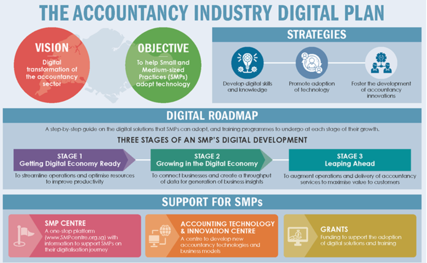 The plan was jointly developed by the Singapore Accountancy Commission (SAC), Institute of Singapore Chartered Accountants (ISCA), and Infocomm Media Development Authority (IMDA) under IMDA's SMEs Go Digital programme.