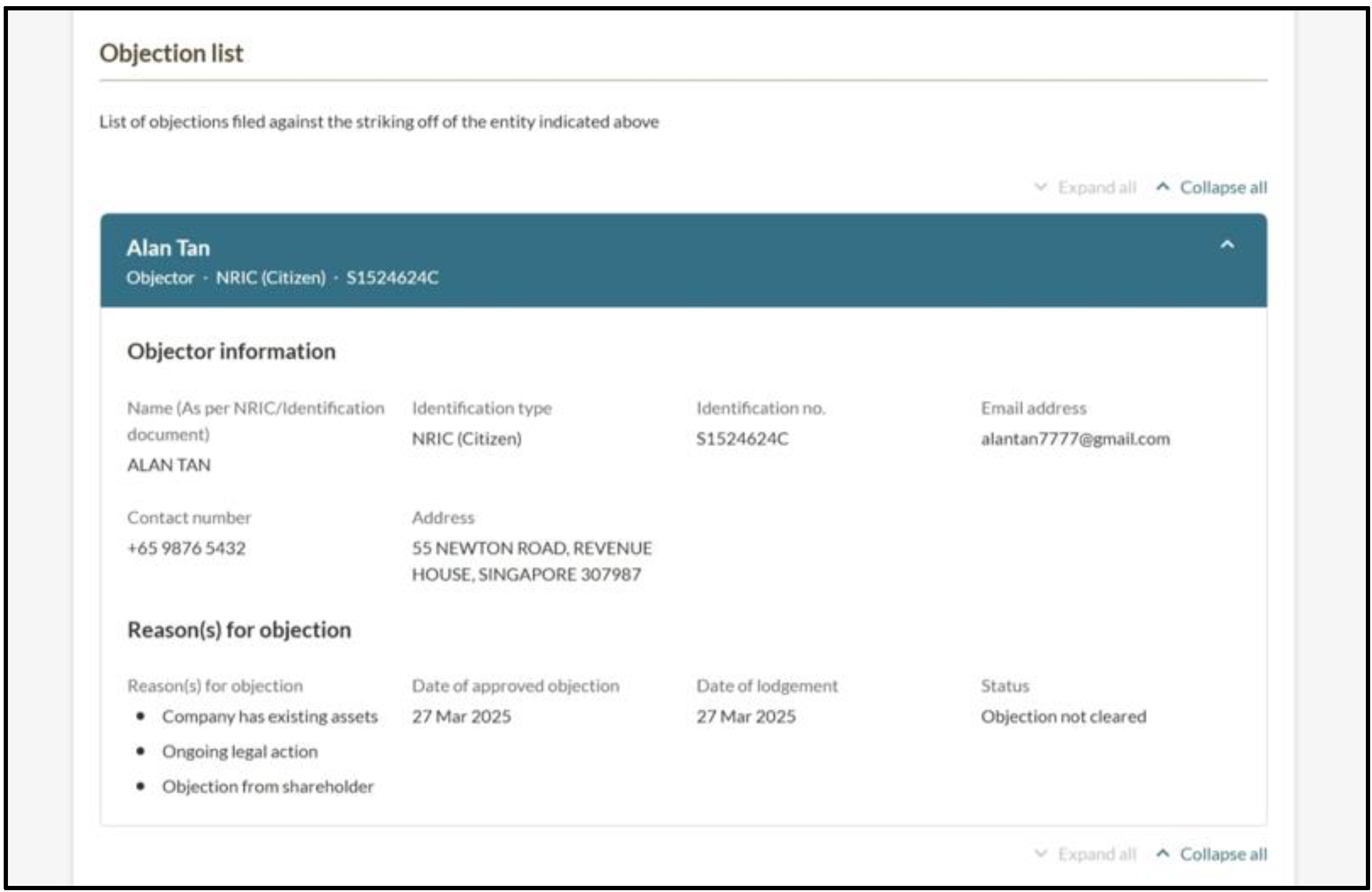 You need to prepare the unique entity number (UEN) of the entity you are clearing the objection against.