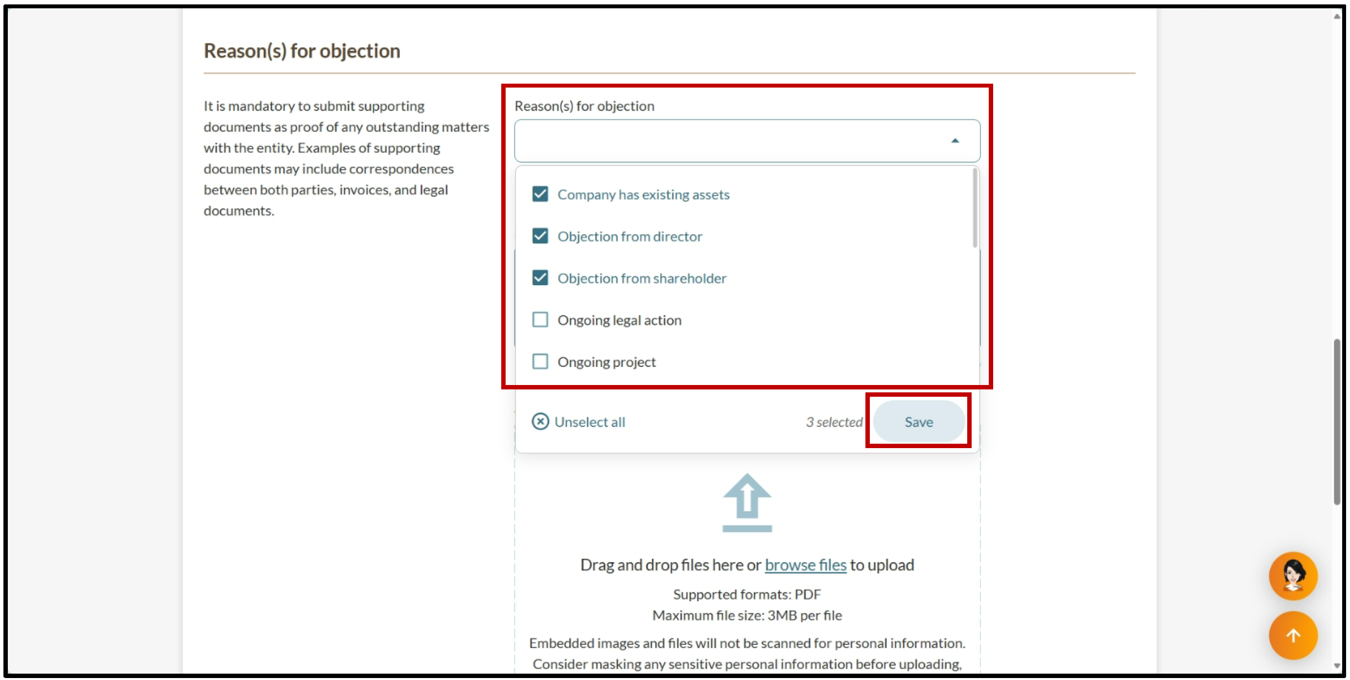 Reasons(s) for objection | If the objection is not raised by a government agency, upload supporting documents as proof of any unresolved matters with the entity. |